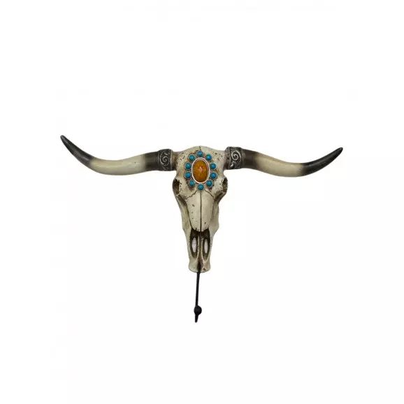 Gancho cabeça de boi importada, produzida em resina endurecida, na cor branca com detalhes em turquesa e uma pedraria na testa. Possui aproximadamente 37cm de comprimente e 27cm de altura com o gancho.