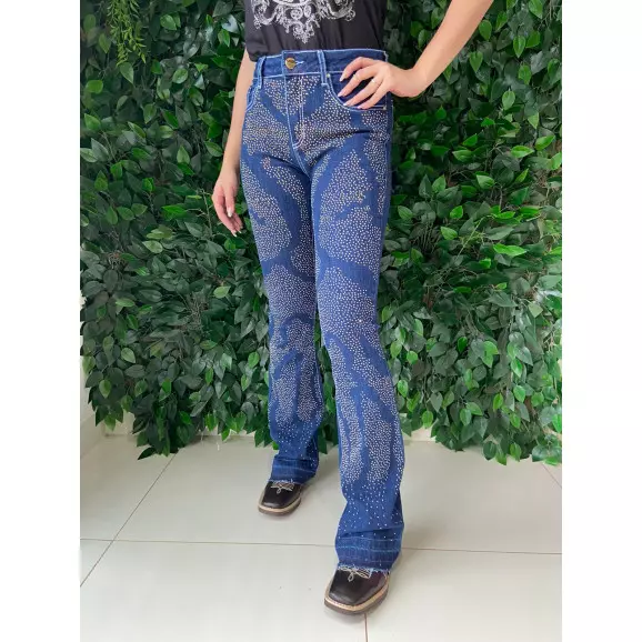 CALÇA FEMININA JEANS, MODELO BOOTCUT, COM BOTÃO E ZÍPER PARA FECHAMENTO FRONTAL, PASSANTE NO CÓS, BOLSOS FRONTAIS E TRASEIROS. DETALHES EM TERMOCOLANTES SOBRE A PEÇA.