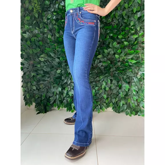 CALÇA FEMININA JEANS, MODELO BOOTCUT, COM BOTÃO E ZÍPER PARA FECHAMENTO FRONTAL, PASSANTE NO CÓS, BOLSOS FRONTAIS E TRASEIROS. DETALHES BORDADOS SOBRE A PEÇA.