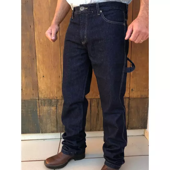 Calça carpinteira confeccionada em tecido jeans sem lycra, cintura justa, coxa relaxada e perna relaxada.