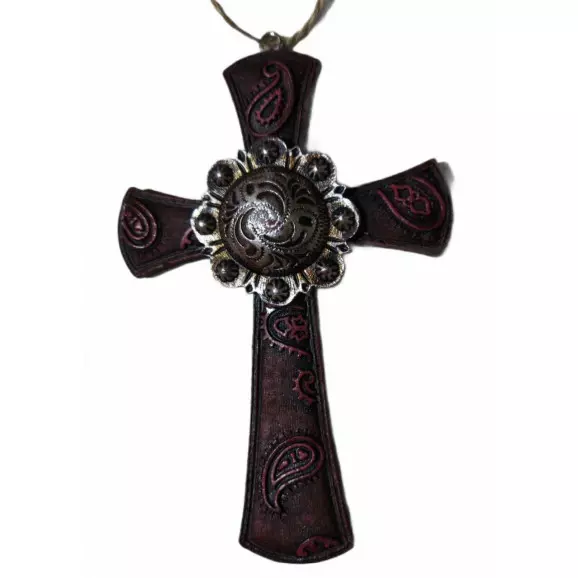 Ornamento de cruz de resina com design rosa paisley e prata concho. Completo com cabide de fio castanho.