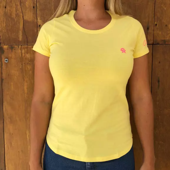 A t-shirt feminina, vem confeccionada na cor amarelo, composta de 100% algodão - fio penteado. Mangas curtas e gola redonda canelada. É confortável e de ótima qualidade.