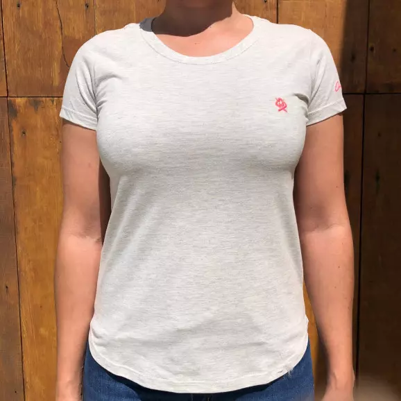 A t-shirt feminina, vem confeccionada na cor mescla clara, composta de 100% algodão - fio penteado. Mangas curtas e gola redonda canelada. É confortável e de ótima qualidade.