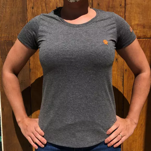 A t-shirt feminina, vem confeccionada na mescla escuro, composta de 100% algodão - fio penteado. Mangas curtas e gola redonda canelada. É confortável e de ótima qualidade.