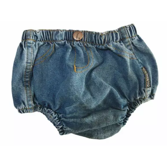 Tapa fralda jeans, 100% algodão. Elásticos nas pernas e cintura. Dois bolsos atrás.